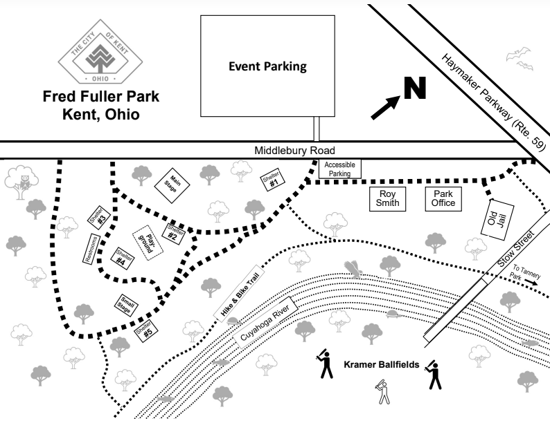Fred Fuller Park, off of Middlebury Road, is Kent’s largest park, encompassing over 56 acres of land given to the City of Kent in 1934 by the Lamson & Sessions Company. The park, which borders and crosses the Cuyahoga River, was developed into a multi-use park over the years, primarily through the involvement of Kent citizens.